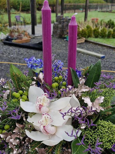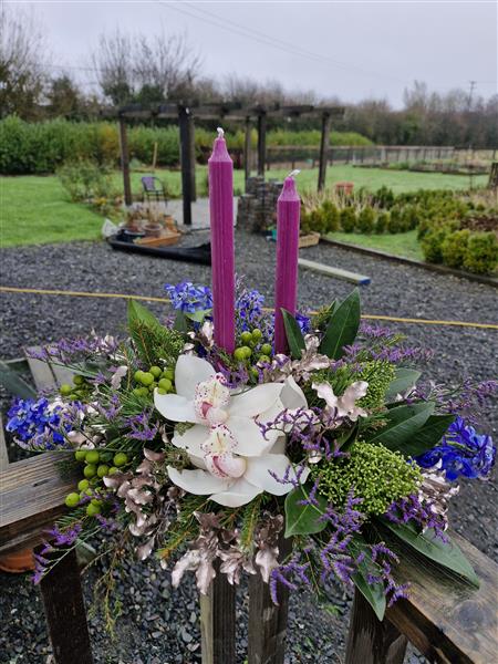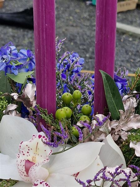 Alternative table arrangement using blue and purple tones metallic foliage.