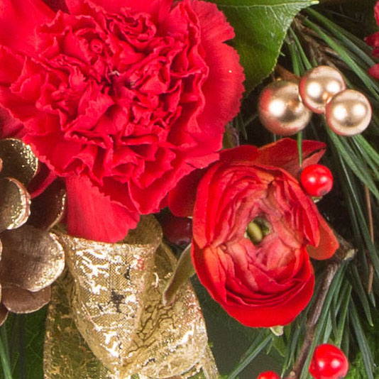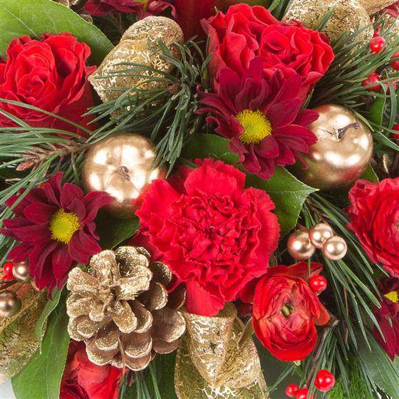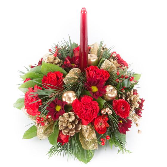 A traditional favorite, this spruce arrangement including cones and berries is perfect as a table centre.